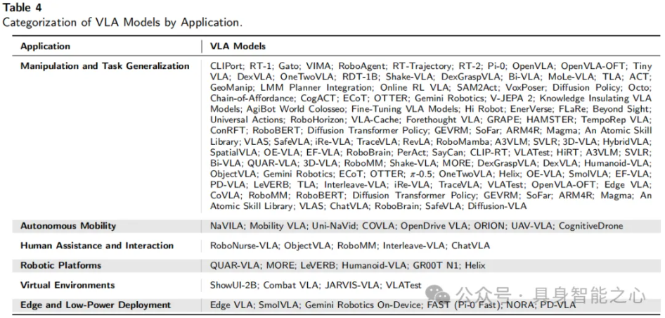 表 4 将 VLA 模型分为六个广泛的应用领域,以下对这些领域进行说明。