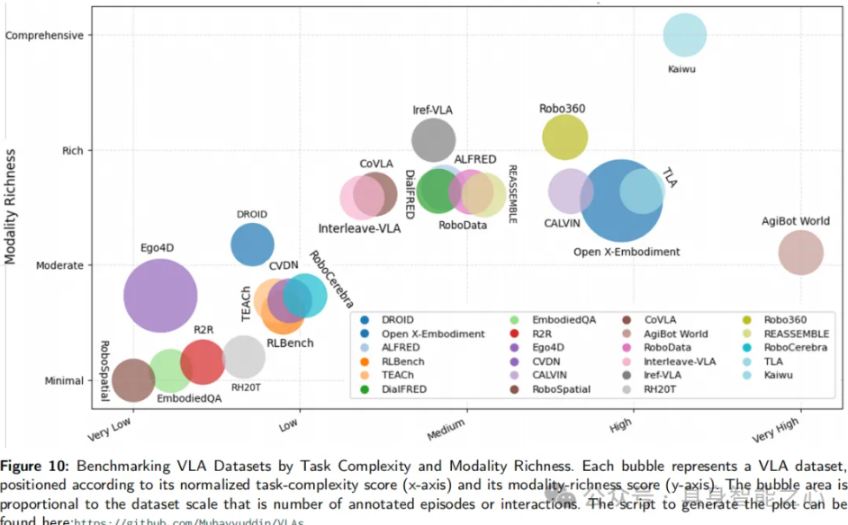 为了进行基准测试,我们将每个主要的 VLA 数据集映射到一个由任务复杂性和模态丰富度构成的二维平面上,如图 10 所示。x 轴反映了每个数据集的操作任务的挑战性,范围从简单的单步动作到长时间跨度、多技能的序列。y 轴表示模态丰富度,从最小(双模态:文本和图像)到全面(包括音频、视频、机器人本体感受、控制、深度、触觉和语言等多达七种模态)。