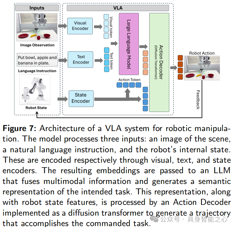 图 7 所示的 VLA 架构代表了一种端到端的框架,是 RT-2、OpenVLA、CLIP-RT、Octo和 RT-1等领先 VLA 系统的典型代表,这些系统均采用基于 Transformer 的视觉和语言骨干网络,并通过跨模态注意力机制进行融合。