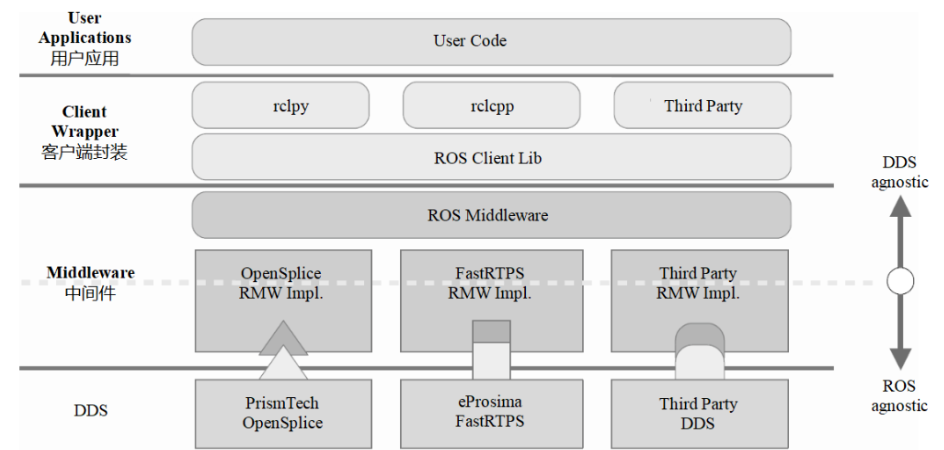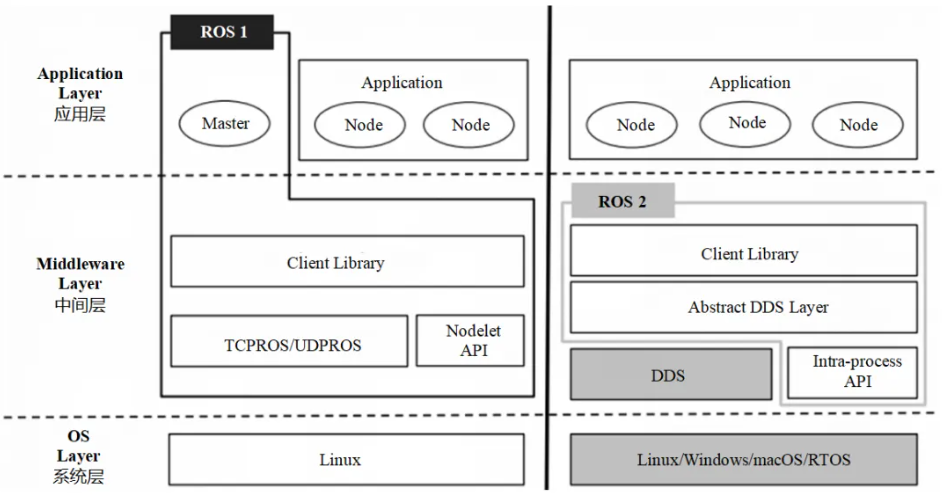 底层是系统层(OS Layer),即可以将ROS安装在哪些操作系统上,ROS 1主要安装在Linux上,ROS 2的可选项很多,Linux、Windows、macOS、RTOS都可以。