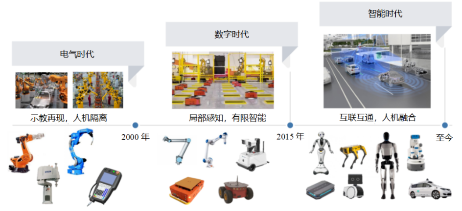 数字时代(2000—2015年):随着计算机和视觉技术的快速发展,机器人的种类不断丰富,涵盖了如AGV、视觉检测等应用。同时,机器人配备的传感器也更为丰富,然而它们仍然缺乏自主思考的能力,智能化水平有限,仅能感知局部环境。这是机器人大时代的前夜。