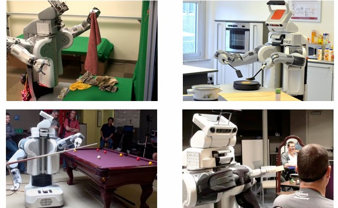 在他们的不懈努力下,PR2已经可以完成叠毛巾、熨烫衣服、打台球、剪头发等一系列复杂的任务(见图2)。以叠毛巾为例,这在当时是轰动机器人领域的重要成果,因为这是机器人第一次实现对柔性物体的处理,虽然在100分钟内只处理了5条毛巾,但在学术层面,这个成果推动机器人研究向前走了一大步。