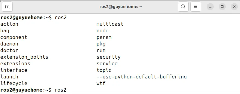 与ROS 1相比,ROS 2对命令行做了大幅集成,所有命令都集成在一个ROS 2的主命令中,例如,“ros2 run”表示启动某个节点,“ros2 topic”表示话题相关的功能。