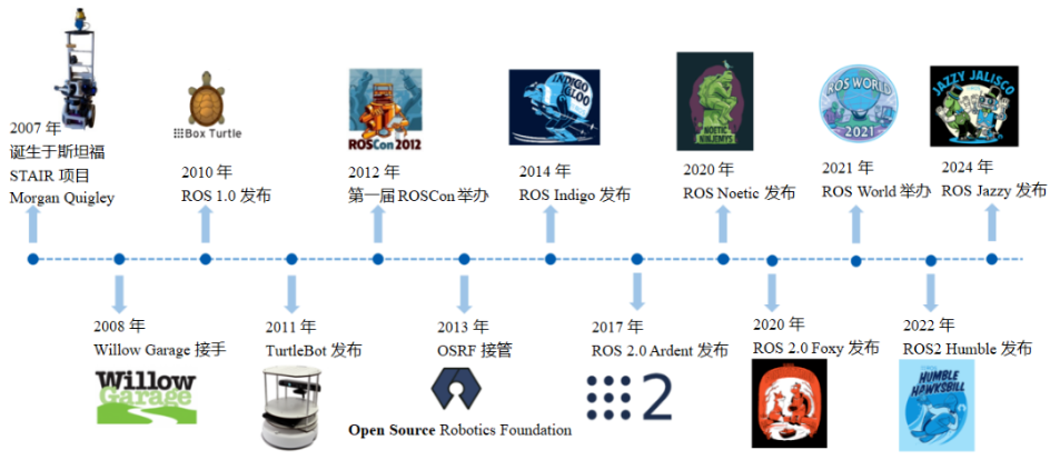 2010年,随着PR2的发布,其中的软件系统名称正式确定,叫作机器人操作系统(Robot Operating System,ROS)。同年,ROS也肩负着让更多人使用的使命,被正式开源,此后,ROS快速发展,如图3所示。