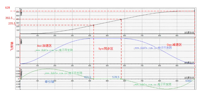 减速区:飞减加速距离:dyDec,牵引轴运行距离:dxAcc,