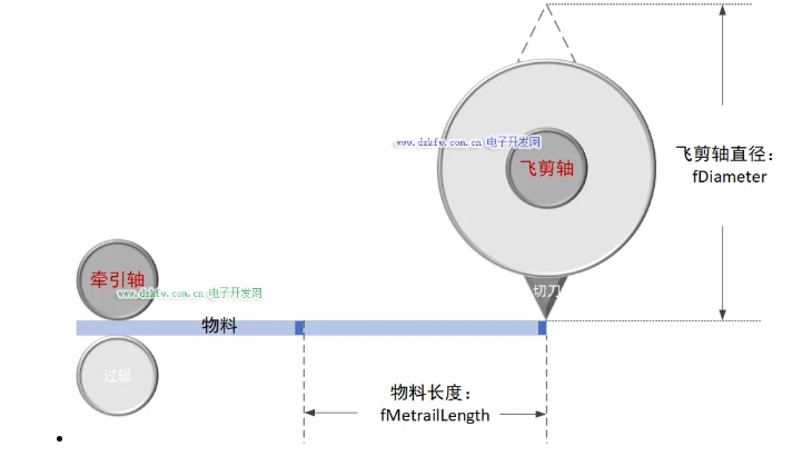 飞剪轴运行完一个周期(一把切刀一个周期就是一周360°,两把切刀一个周期就是180°,三把切刀一个周期就是120°),物料也完成一次输送。