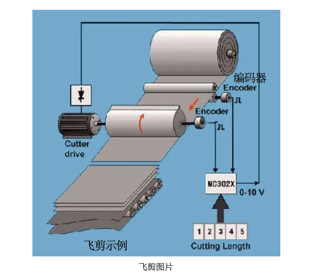 飞剪系统由旋转的刀刃对运动的进给材料按照设定的长度进行剪切,为了提高设备加工效率,要求被剪切材料保持连续进给,而不需在剪切时停顿,是工业生产领域一种常见的控制系统。其控制的难点在于:在被剪切材料高速进给的过程中,剪切刀具能严格与其同步,保证剪切出的板材长度一致。