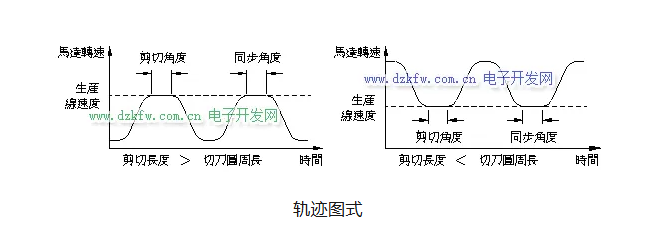 飞剪系统以指定长度的切断,精度高,效率高为目的,在保证物料进给速度的稳定外,还要实时控制刀辊的运行速度,当切断长度正好等于刀辊旋转一周的刀尖轨迹长时,控制刀尖的线速度与物料进给速度完全相同。在实施定长切断的过程中,通过系统控制刀尖与物料进给进行位置随动跟踪,使得伺服电机的编码器脉冲与速度/长度测量辊的编码器脉冲成固定的比例,具体轨迹如下: