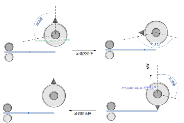 为了保证速度曲线连续,减速区,飞剪轴应该从匀速减速到一个较小的速度。