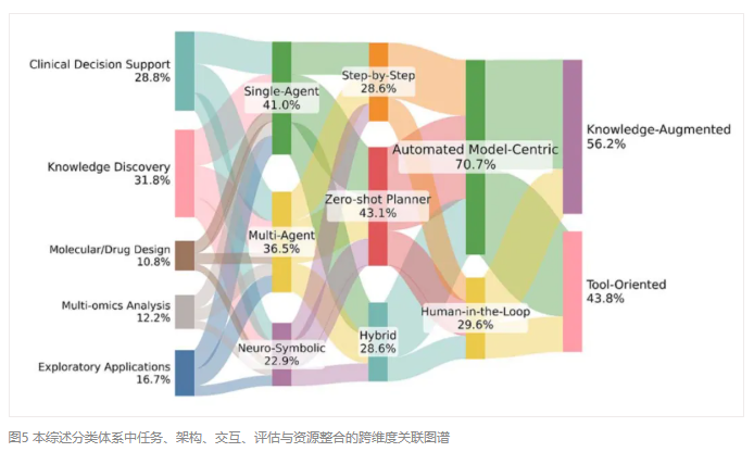 文章通过系统梳理临床分析、分子与药物设计、多组学分析和知识发现等领域的100余项代表性研究,对生物学人工智能智能体的最新进展进行了系统性整合。研究团队提出五维分类法,从任务领域、系统架构、交互模式、评估策略和资源整合维度对现有工作进行组织。基于该框架,分析了常见设计模式,揭示了智能体范式催生的新兴能力,并指出了可靠性、隐私性、可扩展性和标准化评估等关键挑战。本综述整体阐明了生物学人工智能智能体的概念与方法论,为构建更稳健、透明和协作的生物学智能体系统指明了方向。