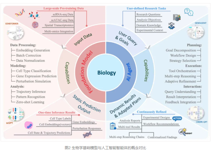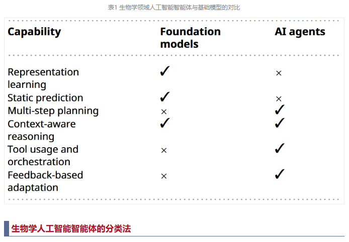 人工智能智能体的目标是超越静态推理,迈向动态推理和自主实验流程。如图2所示,智能体通常采用基础模型作为其核心推理引擎,通过整合用于规划、行动和交互协调的附加模块对其进行扩展。这种设计使得人工智能智能体能够解读科学问题,将其分解为逐步操作,选择合适的工具或资源,检查中间结果并迭代地更新工作流程。这些过程赋予了智能体上下文敏感性和适应性,使其从被动的预测器转变为科学发现过程中的共同研究者。表1总结了生物学中人工智能智能体和基础模型的比较。