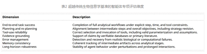智能体特有的评估维度总结在表2中。智能体的性能可以从几个互补的维度进行刻画。首先,显式约束下的端到端任务成功率反映了智能体是否能在有限的步骤、时间和工具预算内,在遵守规定流程的前提下完成完整的分析工作流。其次,规划与重新规划的正确性捕捉了中间步骤与总体目标之间的一致性,以及智能体在遇到中断或检测到不一致后修改其策略的能力。第三,工具使用可靠性不仅涉及选择合适的计算或数据库工具,还包括正确地调用它们,避免参数化错误、输出误解或违反基本的统计假设。第四,证据基础与来源评估结论在多大程度上得到可验证的数据库标识符或原始文献的支持,从而限制无依据的或幻觉式的断言。第五,错误管理与恢复评估智能体是否能够识别现实的生物学或计算故障模式,并评估在合理步骤内采取适当纠正措施是否能改善下游结果。第六,记忆一致性与状态跟踪衡量关键中间产物在整个分析阶段是否保持连贯和准确。最后,长周期稳健性考察智能体行为在良性扰动下的稳定性以及在长时间交互中抵抗性能下降的能力。