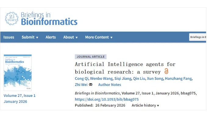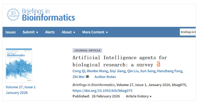 2026年2月26日,新泽西理工学院及汉密尔顿学院的研究人员在《Briefings in Bioinformatics》上发表题为“Artificial Intelligence agents for biological research: a survey”的综述文章。
