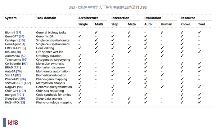 表3中总结的代表性系统展示了为生物学研究设计的人工智能智能体日益增长的多样性。每个系统都体现了架构设计、交互模式、评估方法和资源整合的独特组合。像Biomni、CellAgent和CoScientist这样的多智能体架构强调协作推理和分布式任务分解,而包括 AutoMAxO、Tokensome和mergen在内的神经符号模型则将符号约束或本体结构嵌入语言模型流程中。像GeneGPT、CRISPR-GPT和NagGPT这类工具集成系统将大语言模型连接到外部API或实验数据库,实现了生物信息学任务的自动化检索、验证和执行。逐步推理在决策支持和方案生成智能体中占主导地位,而零样本泛化则更受青睐于像PhenoGPT、scWGBS-GPT、SleepBert和RAG-HPO这样的领域自适应框架中。评估策略涵盖了从全自动基准测试到人在回路验证,反映了生物医学环境中不同水平的实验控制。知识和工具整合仍然是核心:像 BRAD和AutoBA这样的系统将语言模型与经过筛选的生物医学本体和工作流程工具连接起来,以确保可追溯性和可重复性。