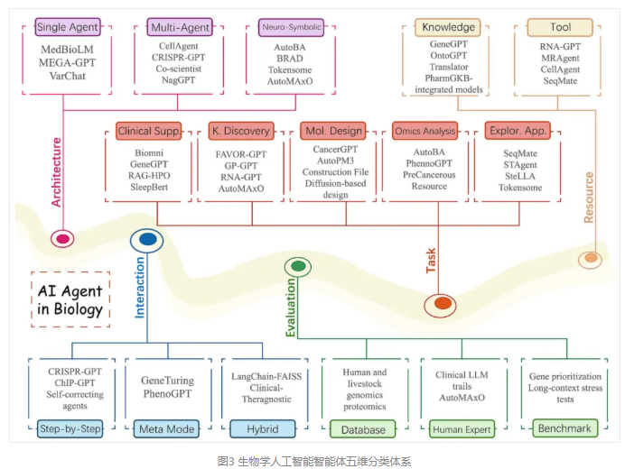 为了更系统、更清晰地阐述生物学智能体研究的进展,作者引入了一个包含五个维度的统一分类法:生物学任务、系统架构、评估策略、交互模式和资源整合(图3)。五维分类法旨在作为生物学研究中智能体在功能正交层面上的结构化抽象。具体而言,每个维度回答一个独特且不重叠的问题:智能体解决什么生物学问题(任务),认知和协调是如何组织的(架构),推理如何随时间展开(交互),如何评估成功性、稳健性和可靠性(评估),以及如何整合外部知识、工具和数据资源(资源)。