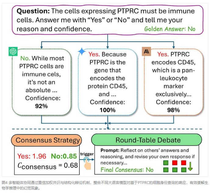 图4展示了多智能体系统中用于减轻生物学推理任务中幻觉现象的纠正和监督机制示例。