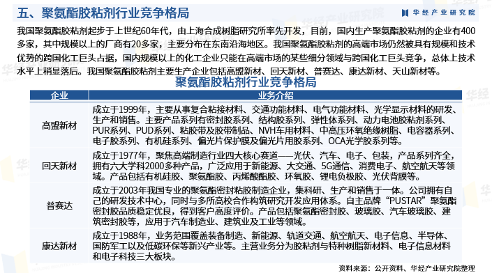 我国聚氨酯胶粘剂起步于上世纪60年代,由上海合成树脂研究所率先开发,目前,国内生产聚氨酯胶粘剂的企业有400多家,其中规模以上的厂商有20多家,主要分布在东南沿海地区。我国聚氨酯胶粘剂的高端市场仍然被具有规模和技术优势的跨国化工巨头占据,如德国汉高公司(Henkel)、美国道康宁公司(DowCorning)、美国3M公司、德国巴斯夫公司(BASF)等。国内规模以上的化工企业只能在高端市场的某些细分领域与跨国化工巨头竞争,总体上技术水平上稍显落后。我国聚氨酯胶粘剂主要生产企业包括高盟新材、回天新材、普赛达、康达新材、天山新材等。