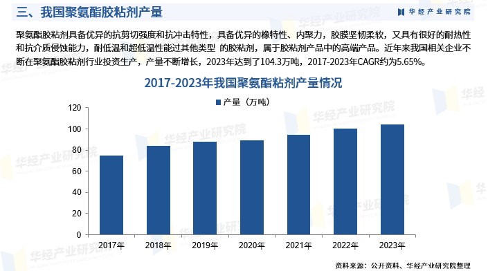 聚氨酯胶粘剂具备优异的抗剪切强度和抗冲击特性,具备优异的橡特性、内聚力,胶膜坚韧柔软,又具有很好的耐热性和抗介质侵蚀能力,耐低温和超低温性能过其他类型 的胶粘剂,属于胶粘剂产品中的高端产品。近年来我国相关企业不断在聚氨酯胶粘剂行业投资生产,产量不断增长,2023年达到了104.3万吨,2017-2023年CAGR约为5.65%。