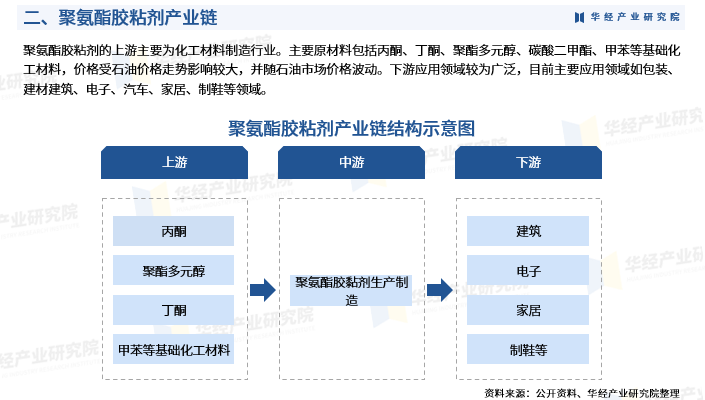 聚氨酯胶粘剂的上游主要为化工材料制造行业。主要原材料包括丙酮、丁酮、聚酯多元醇、碳酸二甲酯、甲苯等基础化工材料,价格受石油价格走势影响较大,并随石油市场价格波动。下游应用领域较为广泛,目前主要应用领域如包装、建材建筑、电子、汽车、家居、制鞋等领域。