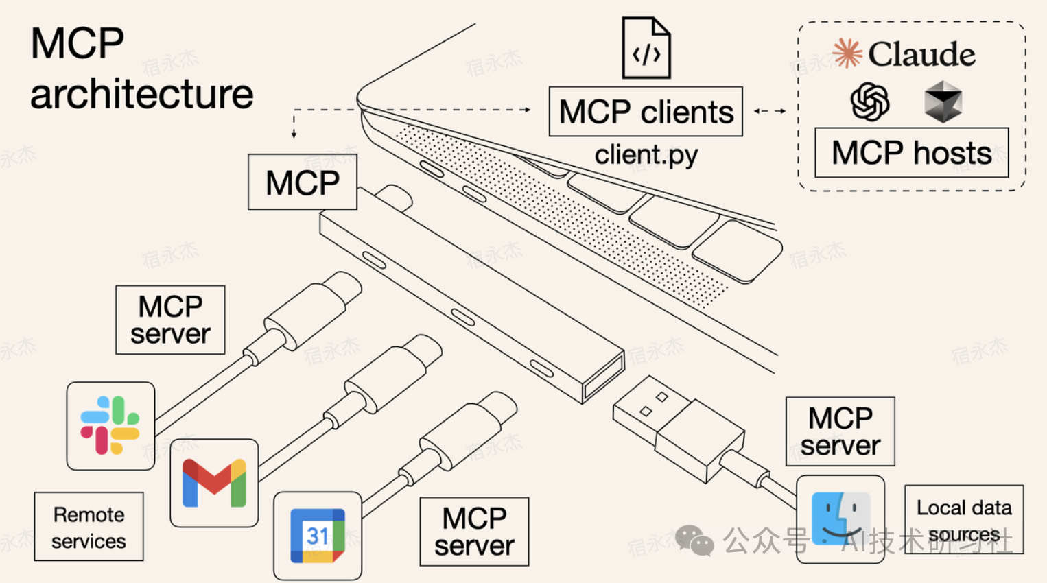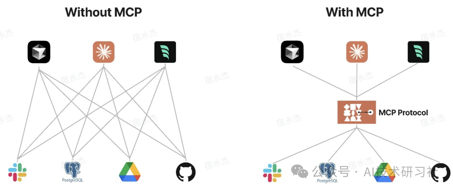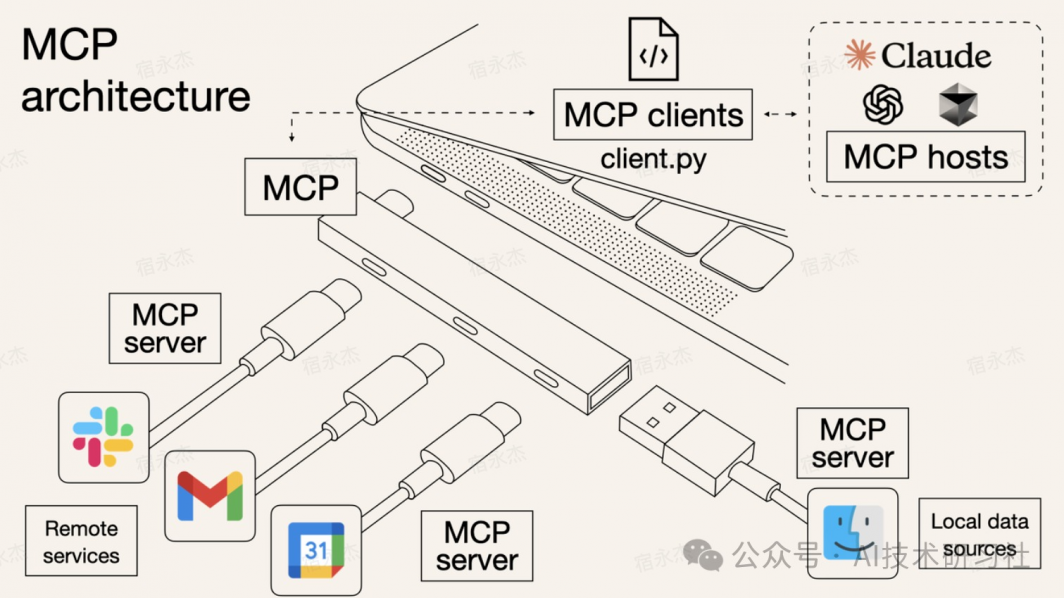 它让各种软件、工具、服务模块,都能像“插头”一样,统一地接入到大语言模型上,被模型灵活调用。
