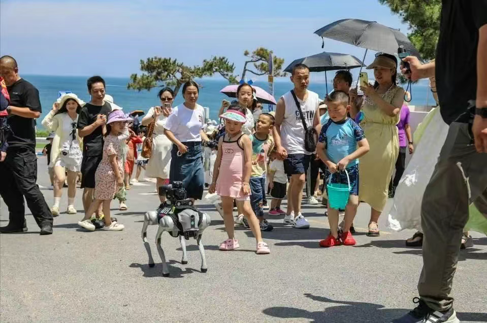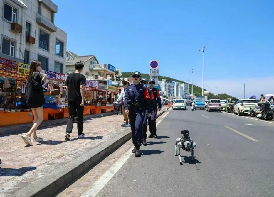 近日,威海热门旅游打卡地火炬八街有一道靓丽的风景线吸引了众多游客:两位英姿飒爽的女警身旁,四足警用机器狗“笨笨”踏着稳健的步伐在人群中穿梭,一边行进,一边持续发出语音提醒。