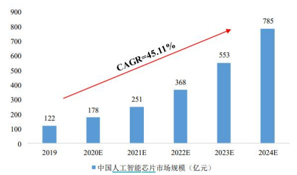 人工智能领域的应用目前处于技术和需求融合的高速发展阶段,在运算加速方面逐渐形成了以GPGPU解决方案为主的局面。根据前瞻产业研究院的数据,未来几年内,中国人工智能芯片市场规模将保持年均40%至50%的增长速度,到2024年,市场规模将达到785亿元。