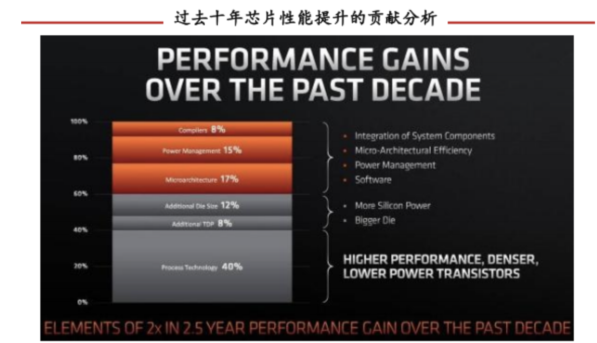 以过去十年CPU的性能大幅度提升为例,根据AMD的分析,在性能提升的贡献上面,制程工艺技术占40%,裸片尺寸和额外的TDP占另外20%,微架构电源管理和编译器构成了图片的其余部分。
