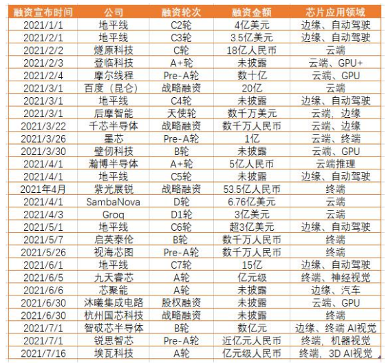 2021年上半年部分AI芯片企业融资情况一览