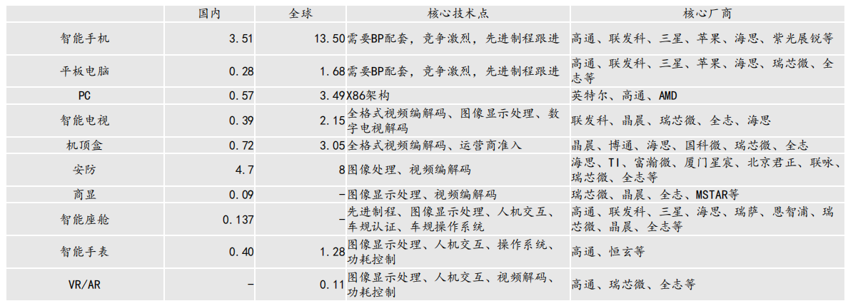 整体来看,处理器芯片下游应用广泛,既包括消费电子如手机、平板、扫地机器人、无人机等,又包括各种类型的行业应用如安防、商显、工业等。对于处理器芯片需求的增长有两个维度,一方面是出货量增长带来的,一方面是性能持续升级带来的。而对于国内芯片厂商来说出货量的增长又可细分为两个维度,一方面是国产替代带来的,另一方面是下游需求增量带动的。