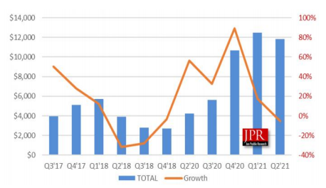 根据GPU行业调研机构jon Peddie Research(JPR)发布的报告显示,2021年第二季度,全球独立显卡市场销售额达118亿美元,同比增幅达到了179%,预计到2023年,整个市场将达441亿美元。 2021年二季度独立显卡的出货量约为1100万块,比第一季度的1200万块减少了2.9%(台式机市场同期增长1.2%),但对比2020年同期的1000万块大幅增加了13.4%,而同期台式机市场只增长了8.0%。 2021年第二季度的厂商份额方面,NVIDIA达到了80%,其次是AMD。