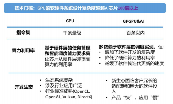 对于GPU用户,产品性能是一个门槛,另一个门槛是易用性,这涉及到生态问题。国外大厂经过多年发展,已经形成了比较强的生态,国内GPU厂商在发展初期一般需要先兼容主流生态来尽可能提升自身芯片的易用性。