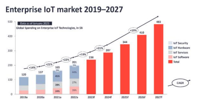 市场研究机构loT Analvtics发布了全球企业物联网支出的跟踪研究报告,报告显示,过去的2022年,全球各行业企业在物联网方面的支出2010亿美元,同比增长了21.5%。在2022年全球经济低迷、疫情打断正常生产的影响下,能实现这一增长实属不易。预计到2027年,企业对物联网的支出将达到4830亿美元