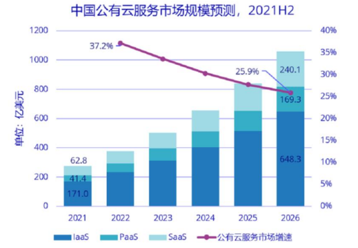 从规模上来看,根据IDC的数据,2021年中国公有云市场达1853亿元。IDC预测,未来5年,中国公有云市场会以复合增长率30.9%继续高速增长,预计到2026年,市场规模将达到1057.6亿美元,中国公有云服务市场的全球占比将从2021年的6.7%提升为9.9%。