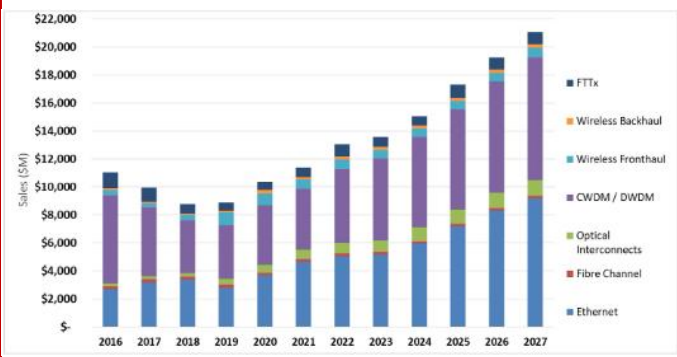 Lightcounting认为,光模块市场在2020年和2021年分别增长17%和10%之后,2022年有望再次实现收入的强劲增长