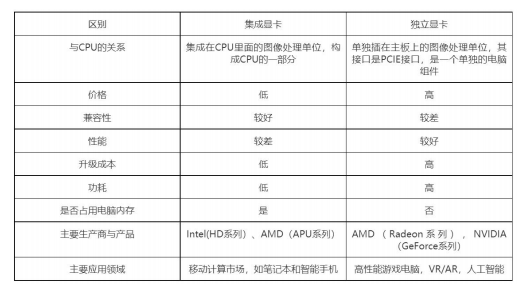 按GPU下游的不同应用,可分为终端GPU,服务器GPU,智能驾驶GPU以及军用显控等其他应用领域GPU。在终端GPU中分为集成GPU(集显)与独立GPU(独显),前者注重轻薄,后者注重性能输出。服务器等高性能需求场景下GPU以独立为主。