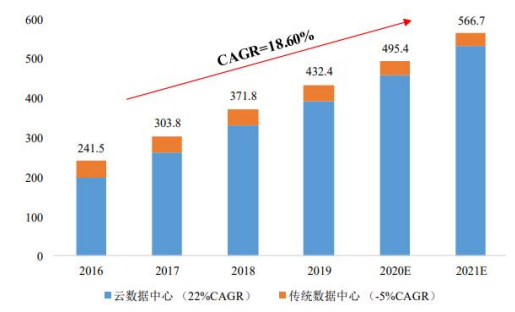 根据Cisco的预计,2021年全球数据中心负载任务量将超过2016年的两倍,从2016年的不到250万个负载任务量增长到2021年的近570万个负载任务量。