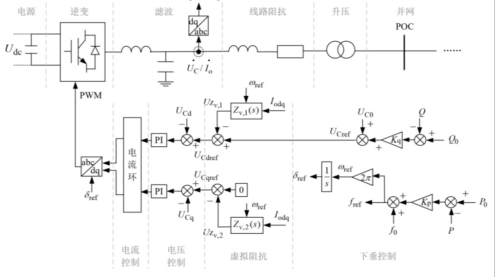 本文对下垂控制中引入电压电流双闭环的必要性和作用进行了分析,并对下垂控制的本质进行了讨论。下垂控制所反映的其实是当网侧状态发生改变时,阀侧要作何响应的问题。下垂控制具有天然适应性,能够顺应网侧变化趋势,控制源端做出相应调整。但这种天然适应性也可能掩盖电压控制点在参数设计上的不足,甚至可能在系统故障时引发系统电压向更深层次跌落。进而,电压参考值的整定成为了下垂控制中的一个重要环节。因此,本文提出一种基于电网等值和系统内电势、内阻抗辨识的电压控制点参数整定方法,能够有效解决上述问题。本文还探讨了虚拟阻抗技术对系统源端特性的影响,并结合多组仿真进行了论证。进一步地,提出了一种双向虚拟阻抗设计方法,有助于在系统正常运行时提升下垂控制作用效果和电压支撑构网能力,并能够在系统发生故障时有效抑制故障过电流。将本文提出的电压参考值设计方法及双向虚拟阻抗策略相结合,可获得更好的控制效果。