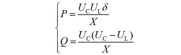 结合图1,考虑电网环境为感性,同时基于小功角假设,列写变流器输出的有功功率和无功功率表达式,如下: