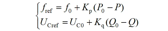 当网侧发生扰动或短路故障导致其电压突然下降时,变流器输出的无功电流和无功功率将瞬时上升,Q0 <Q,Kq为正数,依据下垂特性,UCref将会下降,即为下垂控制设定了一个更低的电压参考值,同样顺应了网侧的电压变化趋势。