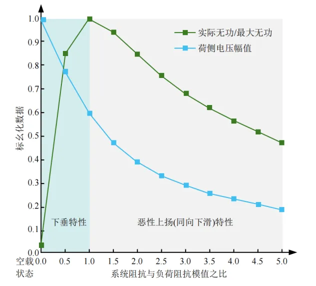 对数据进行标幺化处理,设电压源幅值为1,系统阻抗模值为1。保持负荷功率因数不变,且单组负荷阻抗模值均为2,依次以并联方式增加所投入的负荷阻抗组数(并联负荷投入的组数从1依次增加至10,负荷额定容量随投入组数增加而依次增大),可绘制出如图4所示的图像,图中纵坐标分别代表荷侧电压幅值、无功功率标幺值(以可达到的最大无功功率为基准),横坐标代表系统阻抗与负荷阻抗模值之比。