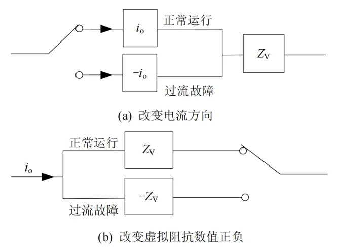 在将虚拟阻抗接入系统时,部分设计者常刻意将流过虚拟阻抗上的电流设计为反向(即其电流正方向为网侧流向阀侧),也可以理解为是加入一种反向虚拟阻抗。相关研究领域通常意义上所指的“虚拟阻抗”,正是这种反向虚拟阻抗,此时的虚拟阻抗并不是以类似于线路阻抗的方式加在系统中,而是成为变流器源侧等值内抗的一部分。由此,相当于在变流器原有输出电压的基础上减去一个由虚拟阻抗所带来的压降,从而起到降低变流器机端输出电压的作用,进而实现对过电流的抑制。