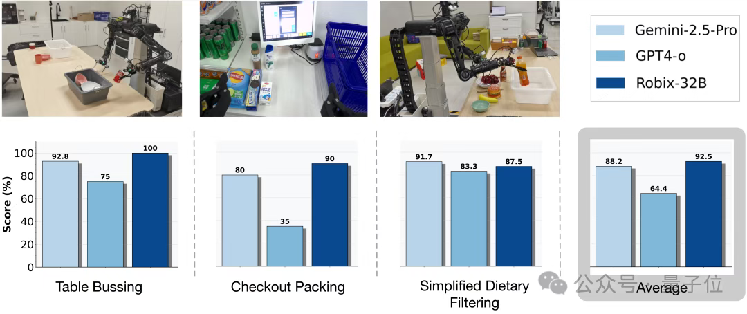 而使用GR-3进行在线评估时,在自动化真实机器人评估中,Robix-32B的平均任务进度达到92.5%,分别比Gemini 2.5 Pro和GPT-4o高出4.3和28.1个百分点。