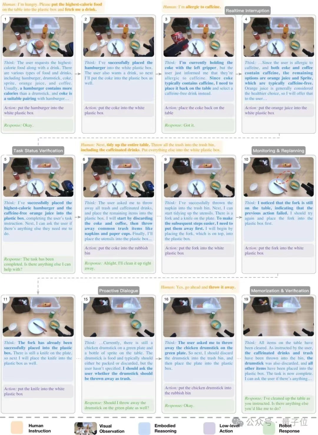 而Robix本身也并不是多个模块拼合的散装大脑,而是一个视觉-语言融合的单模型,能同时处理画面、语言,还能把思考过程、动作指令、人类回复整合在一个逻辑循环里,避免模块间沟通卡顿。