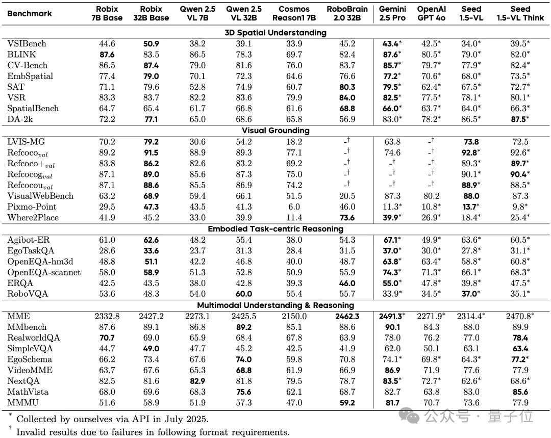 在基础能力测试上,Robix的两个版本(7B和32B)在8个空间理解任务中有7个比Qwen2.5-VL 表现好,平均准确率更高;