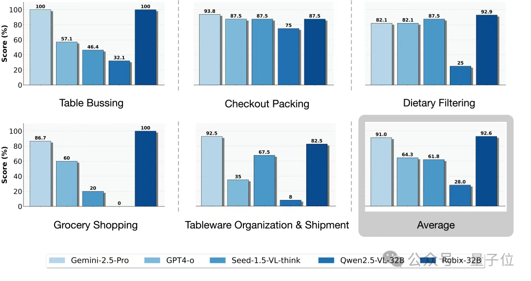 在模拟真实环境的交互测试,使用UMI设备在线评估,Robix-32B在5个任务中的3个超越Gemini 2.5 Pro,且平均任务进度略高,且大幅超越Qwen2.5-VL-32B。