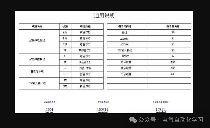 使用公司内部制作的通用说明表模板,或自行设计符合项目需求的通用说明表。该表格应包含电线截面积、通讯电缆命名规范、设备命名规范、线号命名规则、标签命名规范等关键信息。