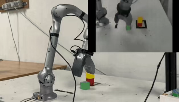 玩堆积木,稳稳当当。重点是,右上角小窗口呈现出世界模型对后续动作视频的预测,能发现和实际操作情形十分吻合。