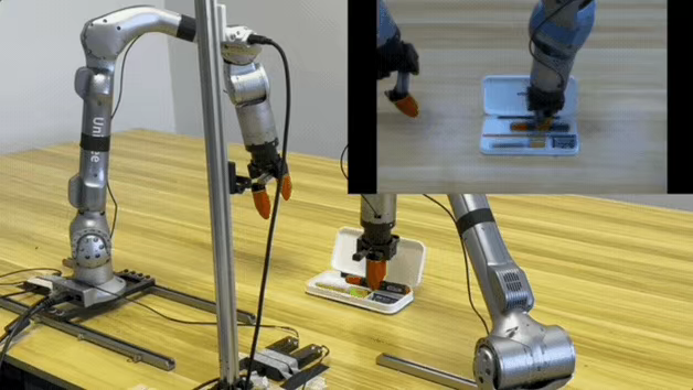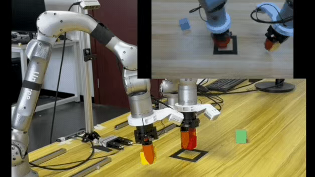 两只机械臂搭档干活也可以:像收纳文具这类稍精细的活儿,都能轻松拿捏: