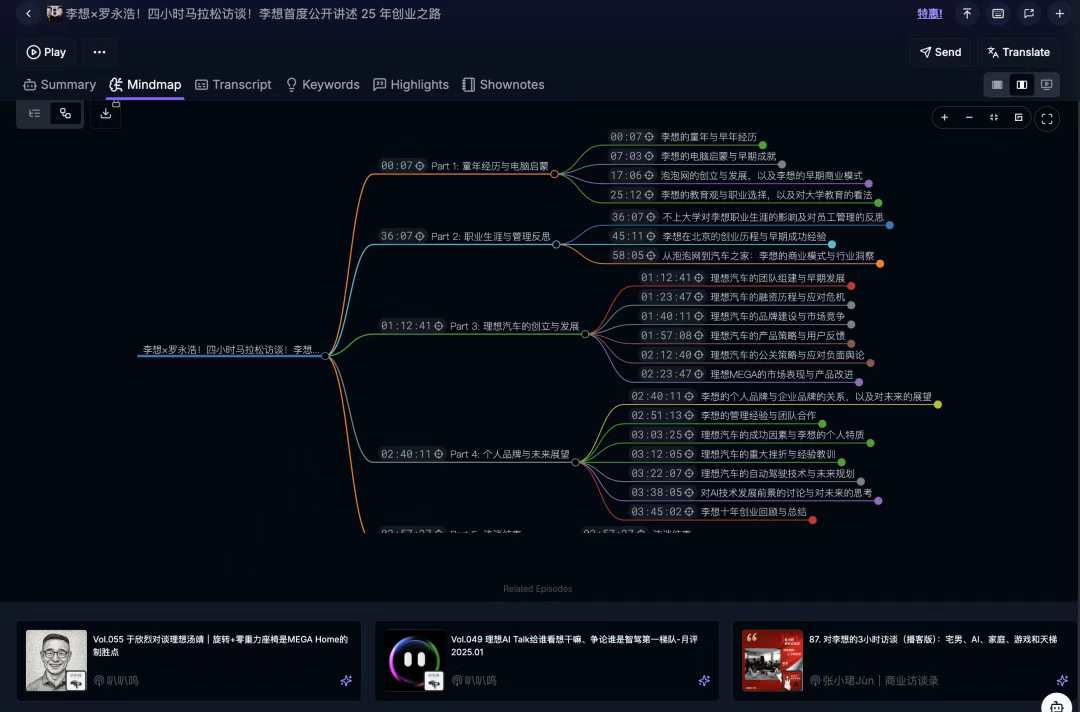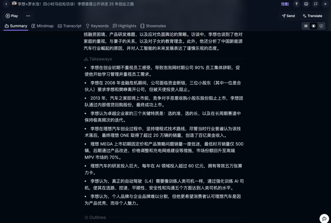 很多人把播客当学习渠道,比如老罗采访李想那期4小时的节目,有价值的内容会反复听、做笔记。Podwise能帮他们更好地消化这些内容。