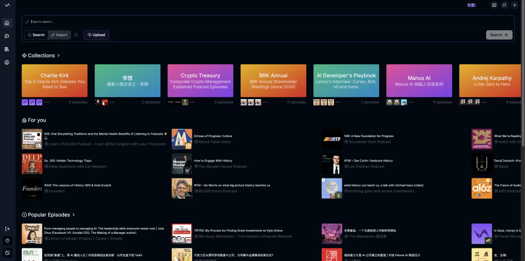 平台上有您订阅的播客更新,还有热门内容板块,能看到大家都在看的转录好的节目。